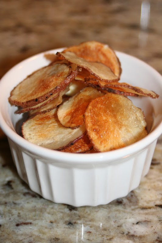 Microwaved Potato Chips - thin and crispy just like the bag, with no added fat! Slice potatoes thin, sprinkle with salt, lay flat on a microwave safe plate, microwave for 3 minutes, flip over and microwave another 3 minutes.